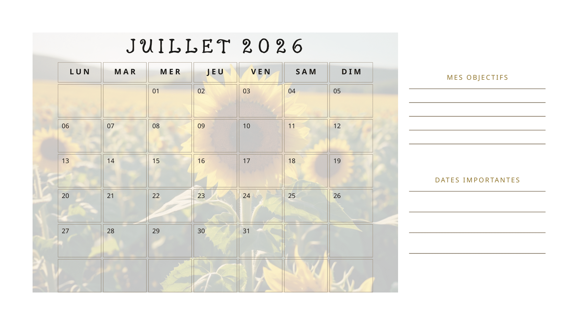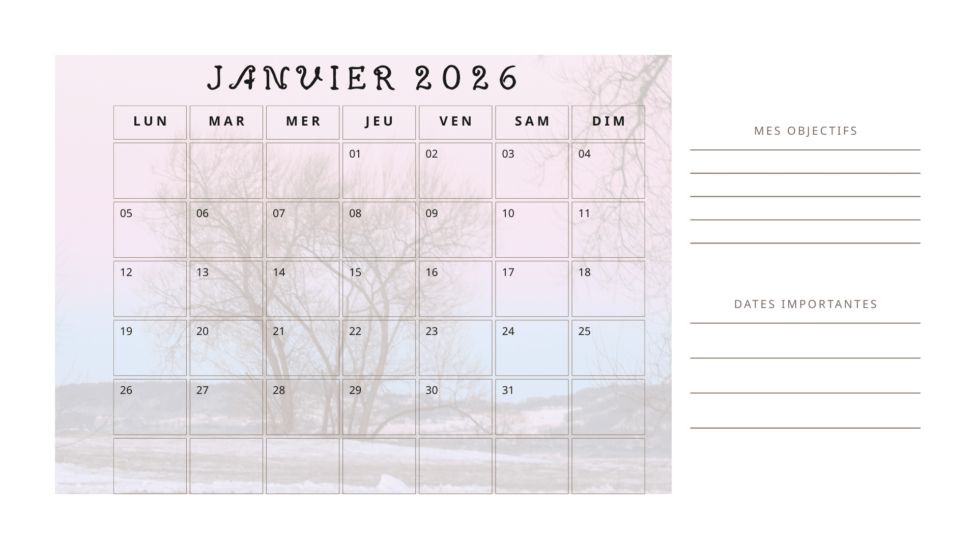 Transformez votre année 2026 avec ce calendrier imprimable A4 horizontal, magnifiquement illustré de photos de paysages naturels. Chaque mois est présenté sur une page séparée, photo du fond avec transparence pour permettre une visibilité parfaite du calendrier tout en laissant de la place pour écrire vos notes, rendez-vous, objectifs et annotations.